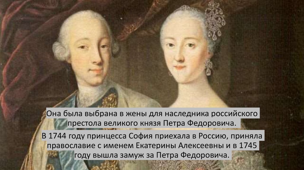 Она была выбрана в жены для наследника российскогопрестола великого князя Петра Федоровича.
