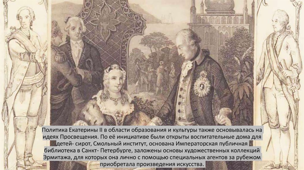 Политика Екатерины II в области образования и культуры также основывалась наидеях Просвещения. По её инициативе были открыты воспитательные дома для