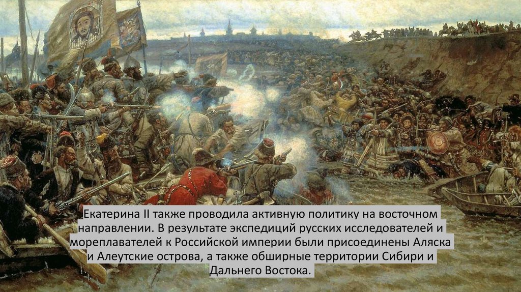 Екатерина II также проводила активную политику на восточномнаправлении. В результате экспедиций русских исследователей и