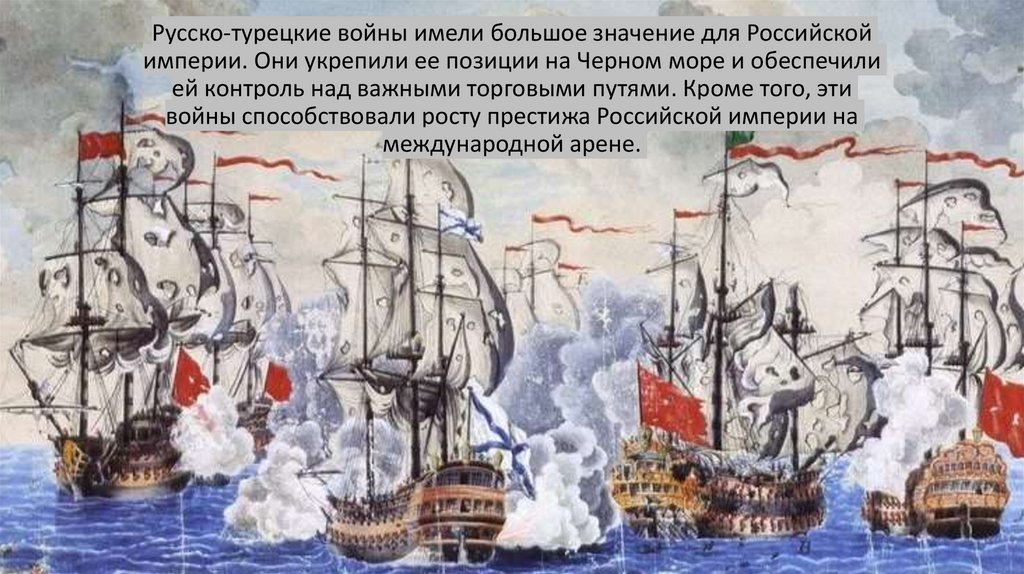 Русско-турецкие войны имели большое значение для Российскойимперии. Они укрепили ее позиции на Черном море и обеспечили