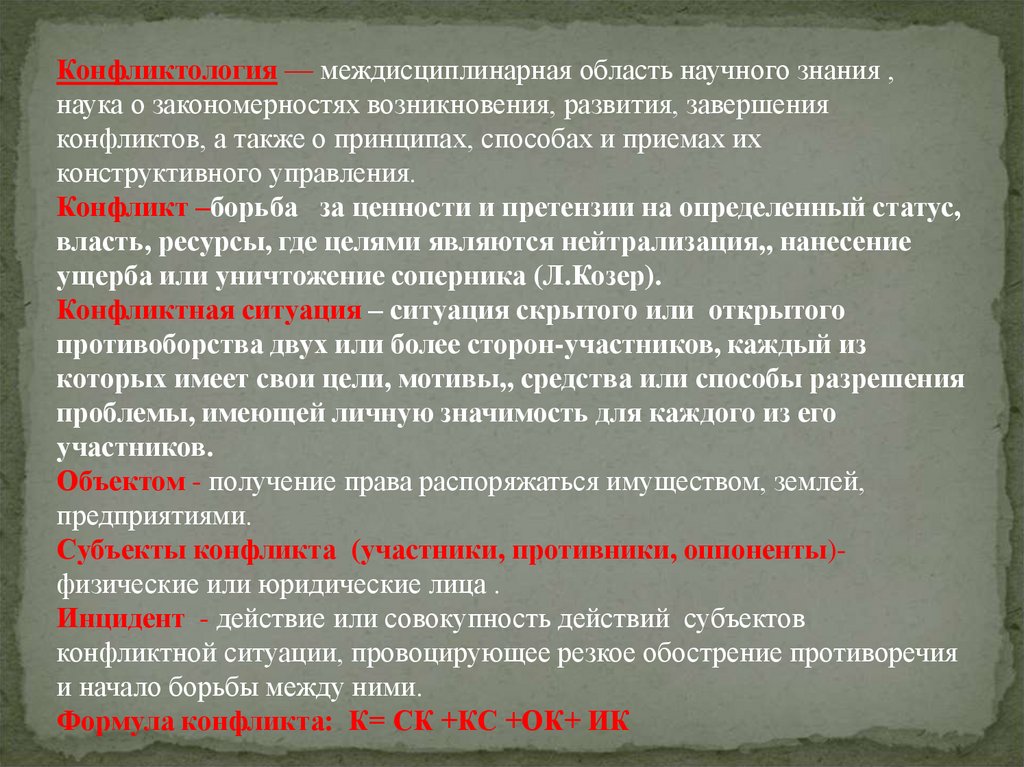 Конфликтология — междисциплинарная область научного знания ,наука о закономерностях возникновения, развития, завершения
