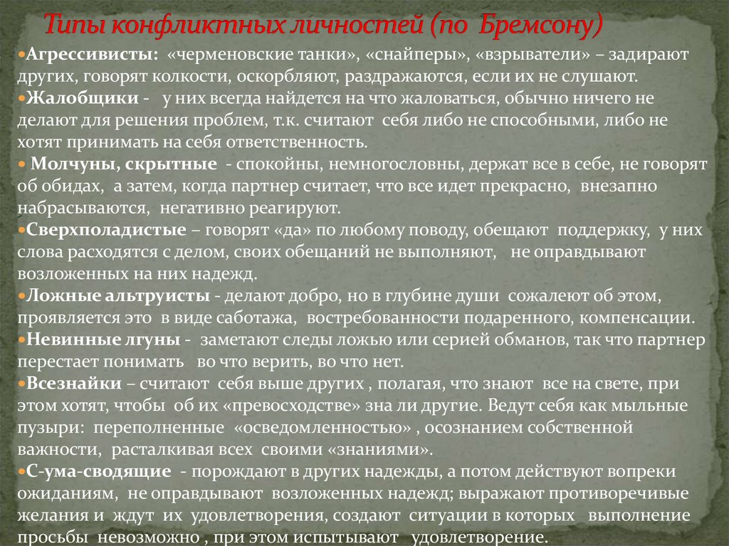 Типы конфликтных личностей (по С. М. Емельянову)23. Типы конфликтных личностей (по Бремсону)