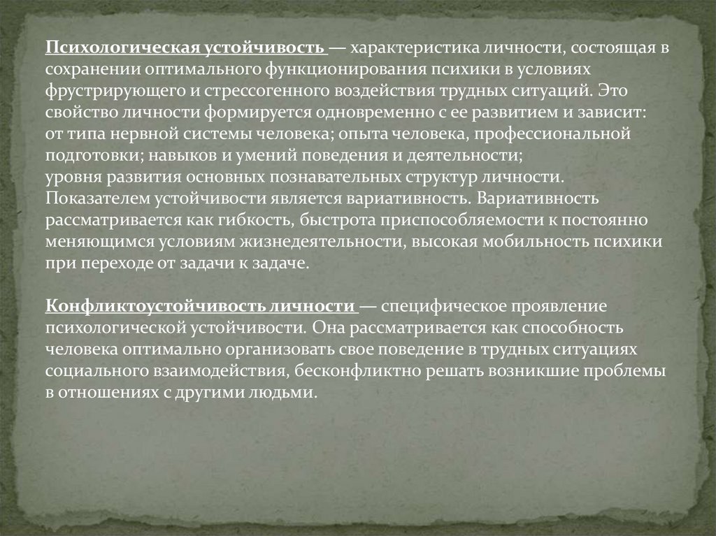 Психологическая устойчивость — характеристика личности, состоящая всохранении оптимального функционирования психики в условиях