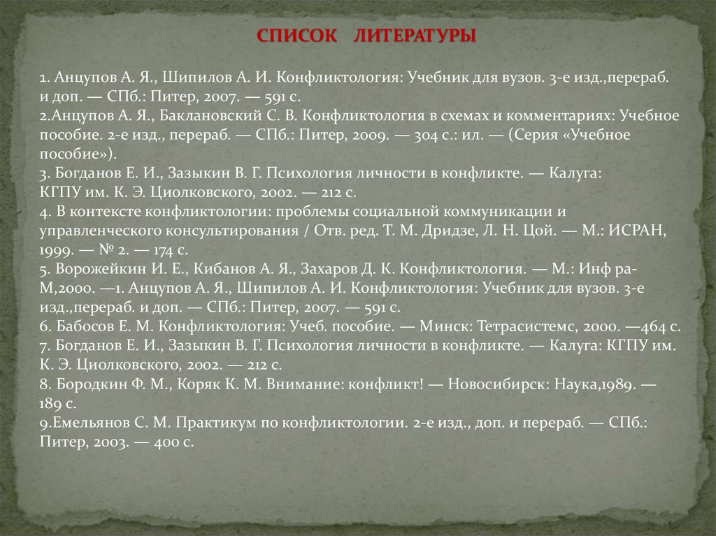 СПИСОК ЛИТЕРАТУРЫ1. Анцупов А. Я., Шипилов А. И. Конфликтология: Учебник для вузов. 3-е изд.,перераб.