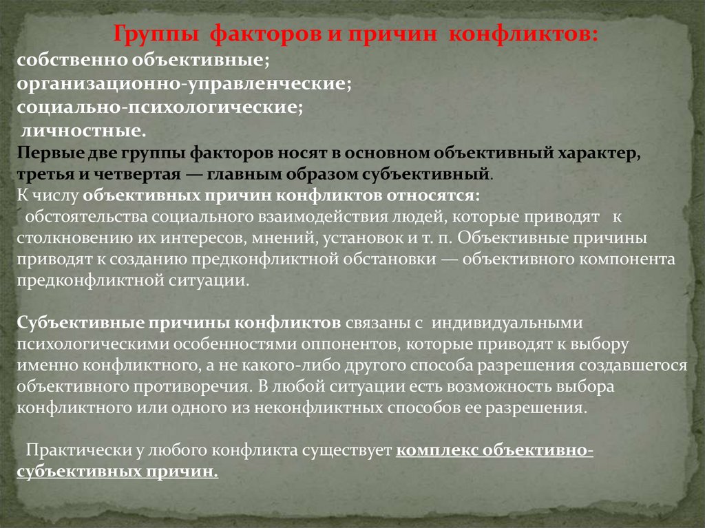 Группы факторов и причин конфликтов:собственно объективные;