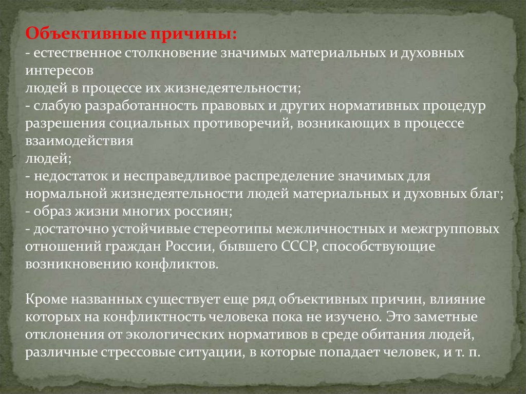 Объективные причины:- естественное столкновение значимых материальных и духовных