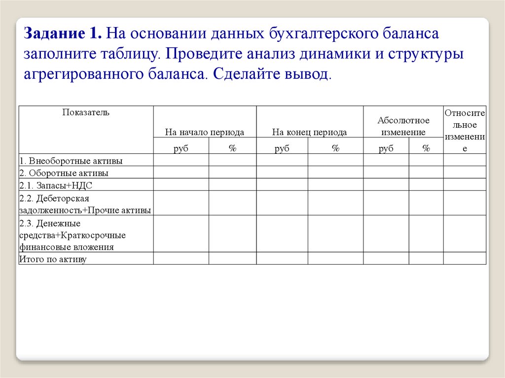 Задание 1. На основании данных бухгалтерского балансазаполните таблицу. Проведите анализ динамики и структуры