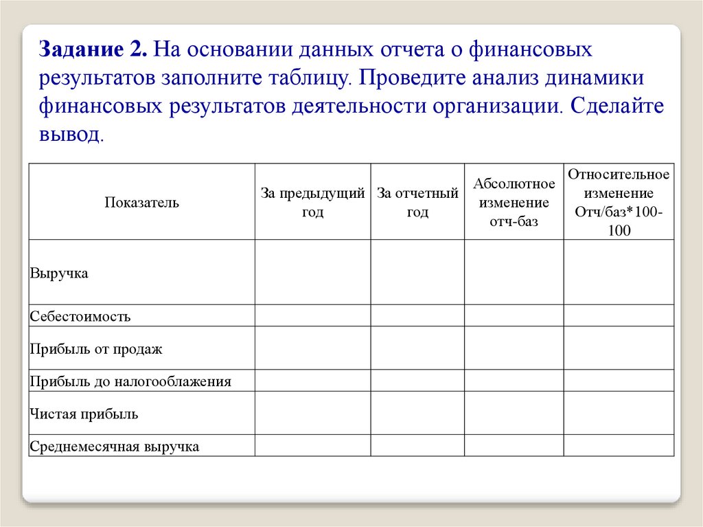 Задание 2. На основании данных отчета о финансовыхрезультатов заполните таблицу. Проведите анализ динамики