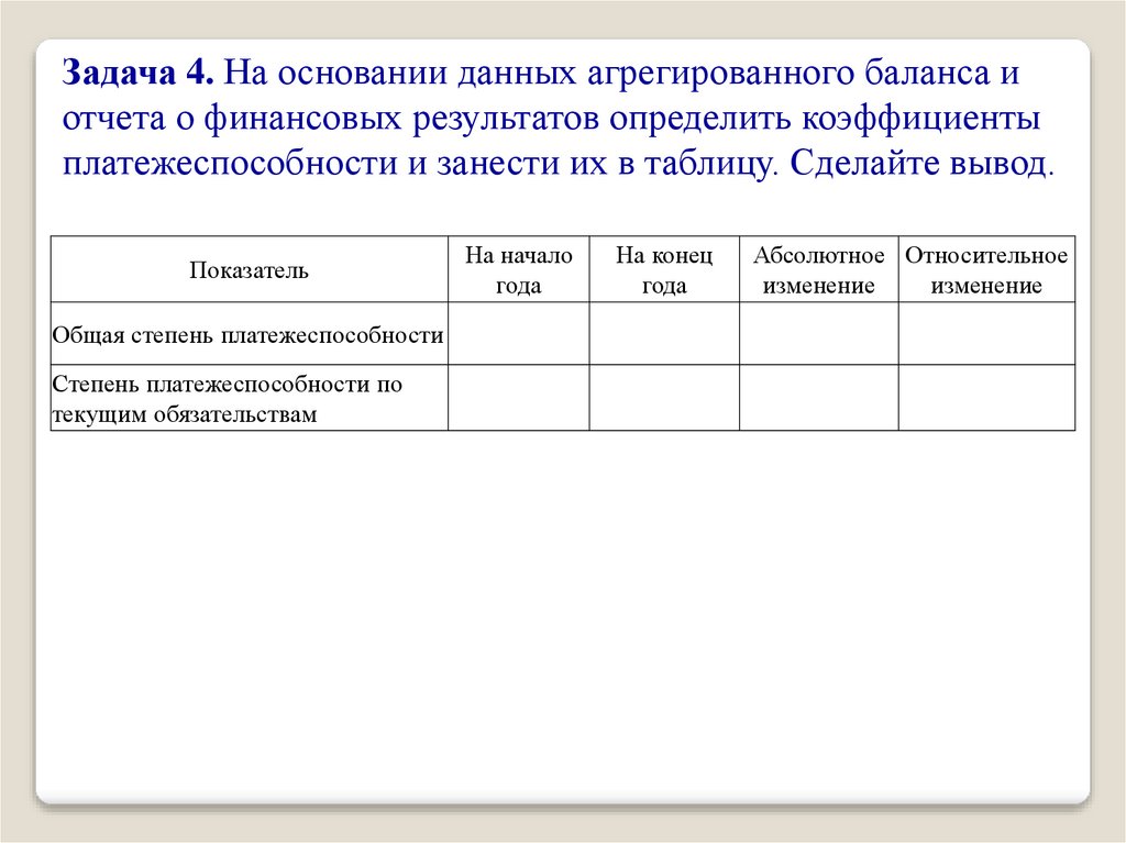 Задача 4. На основании данных агрегированного баланса иотчета о финансовых результатов определить коэффициенты