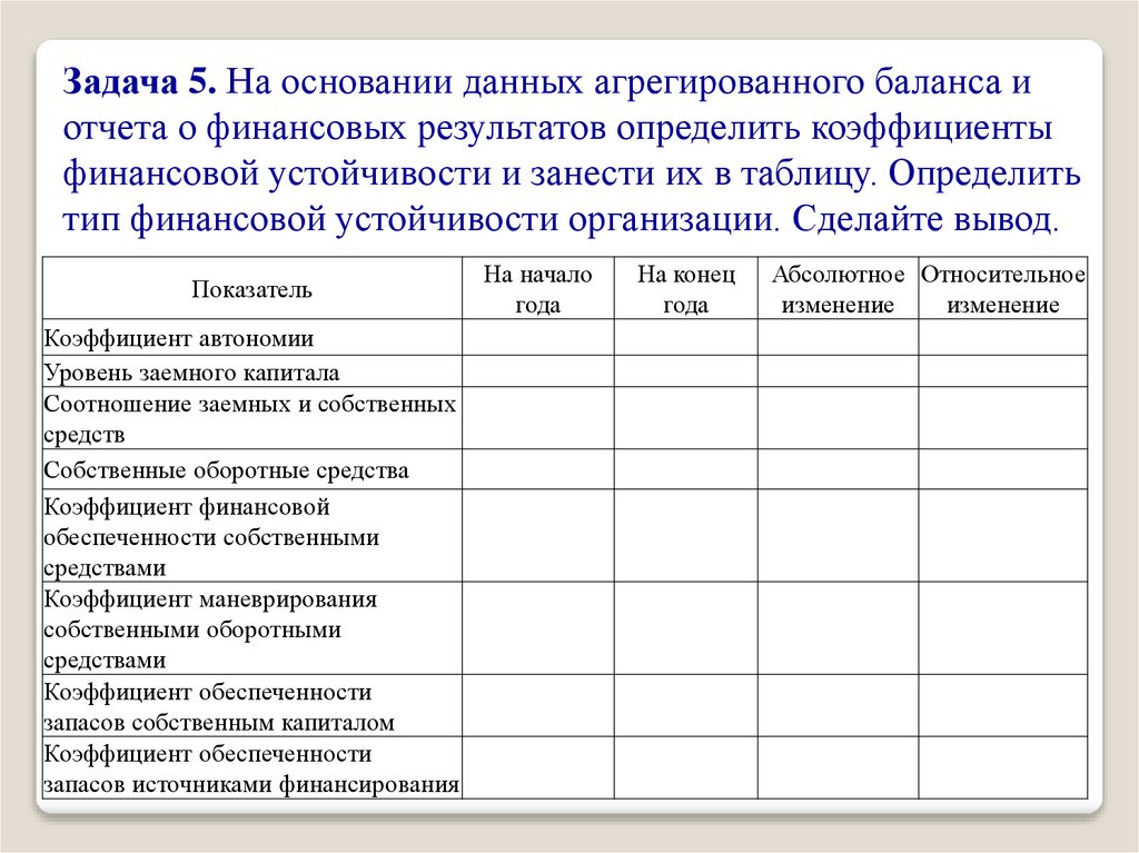 Задача 5. На основании данных агрегированного баланса иотчета о финансовых результатов определить коэффициенты