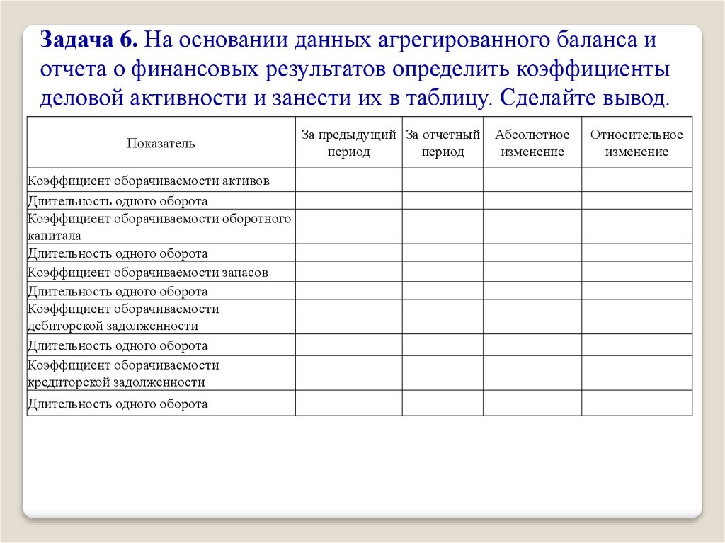 Задача 6. На основании данных агрегированного баланса иотчета о финансовых результатов определить коэффициенты