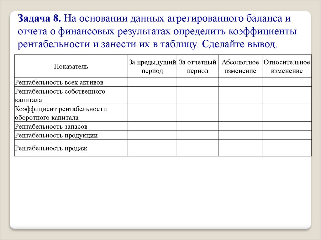 Задача 8. На основании данных агрегированного баланса иотчета о финансовых результатах определить коэффициенты