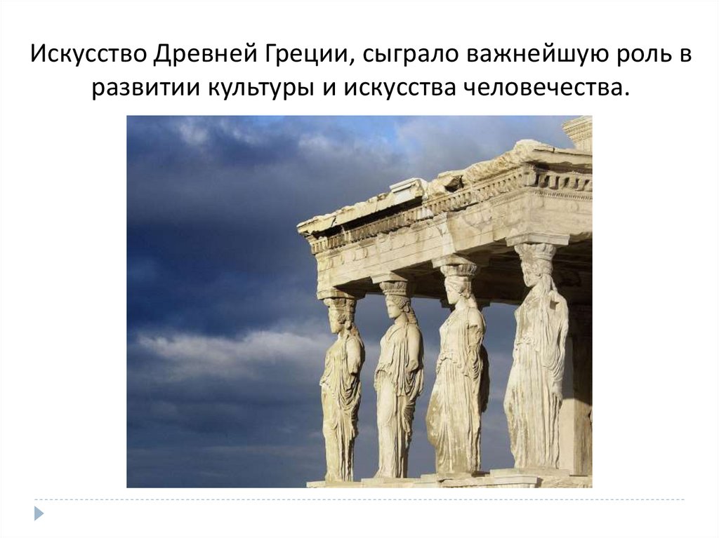 Искусство Древней Греции, сыграло важнейшую роль вразвитии культуры и искусства человечества.