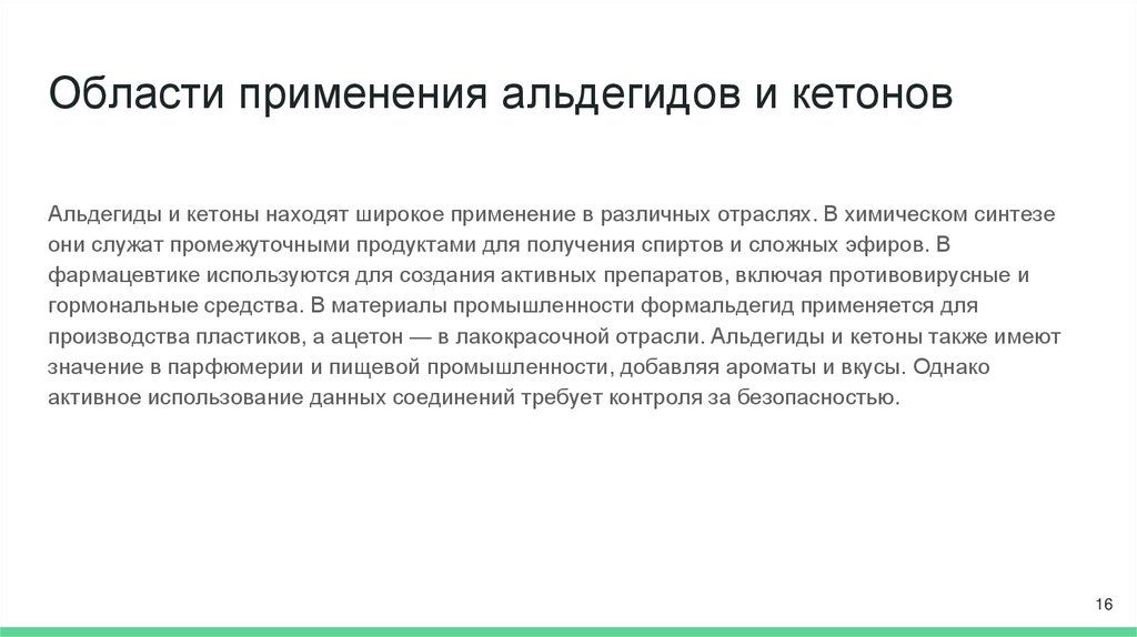 производства пластиков, а ацетон — в лакокрасочной отрасли. Альдегиды и кетоны также имеют