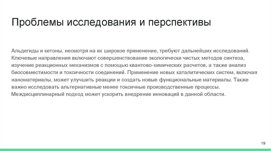 Проблемы исследования и перспективыАльдегиды и кетоны, несмотря на их широкое применение, требуют дальнейших исследований.