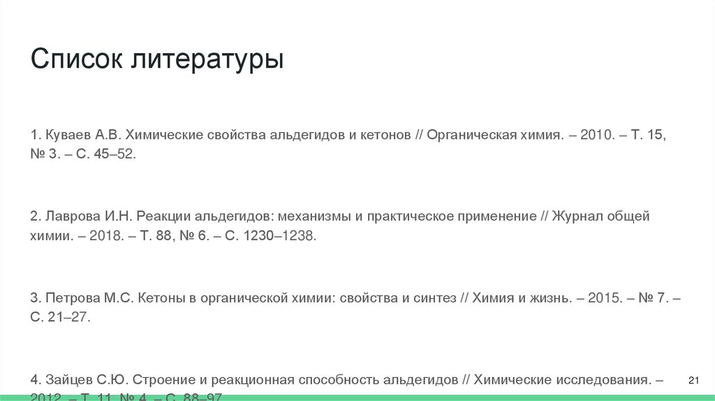 Список литературы1. Куваев А.В. Химические свойства альдегидов и кетонов // Органическая химия. – 2010. – Т. 15,