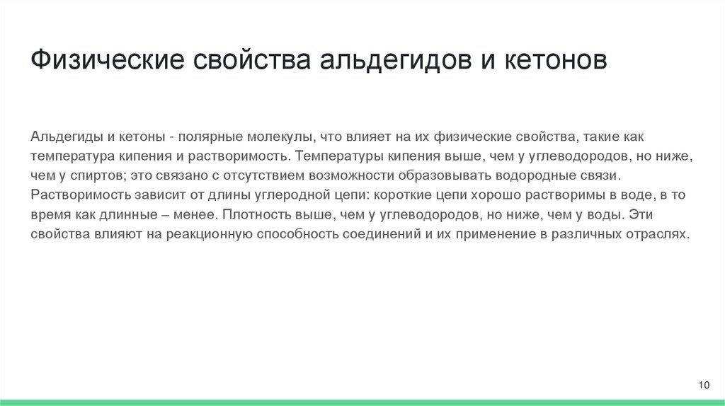 Физические свойства альдегидов и кетоновАльдегиды и кетоны - полярные молекулы, что влияет на их физические свойства, такие как