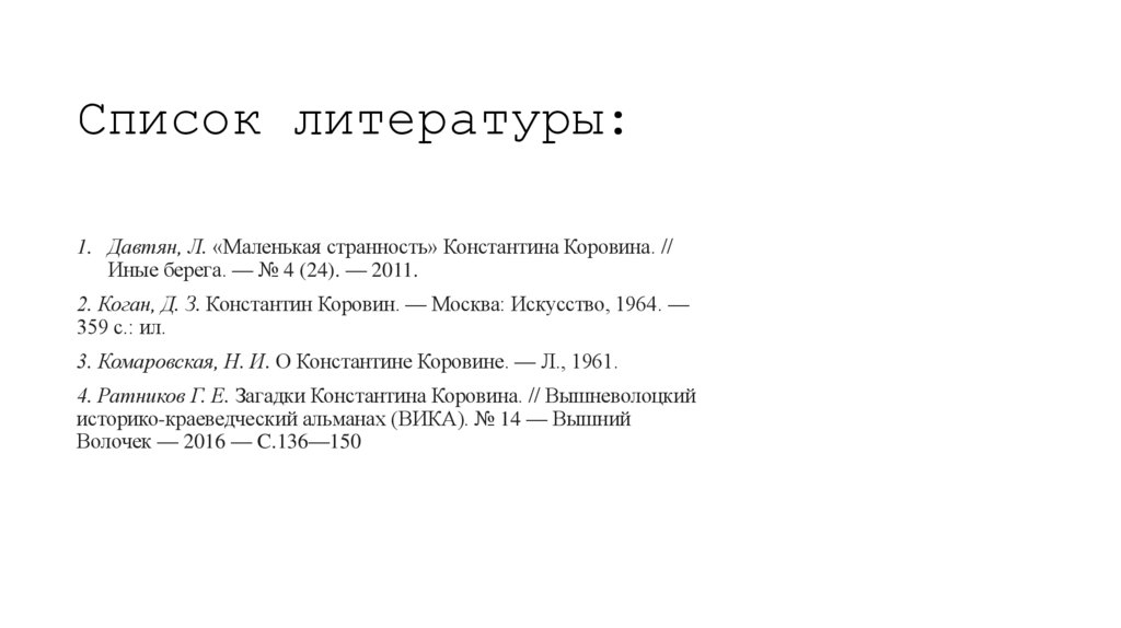 Список литературы:1. Давтян, Л. «Маленькая странность» Константина Коровина. //