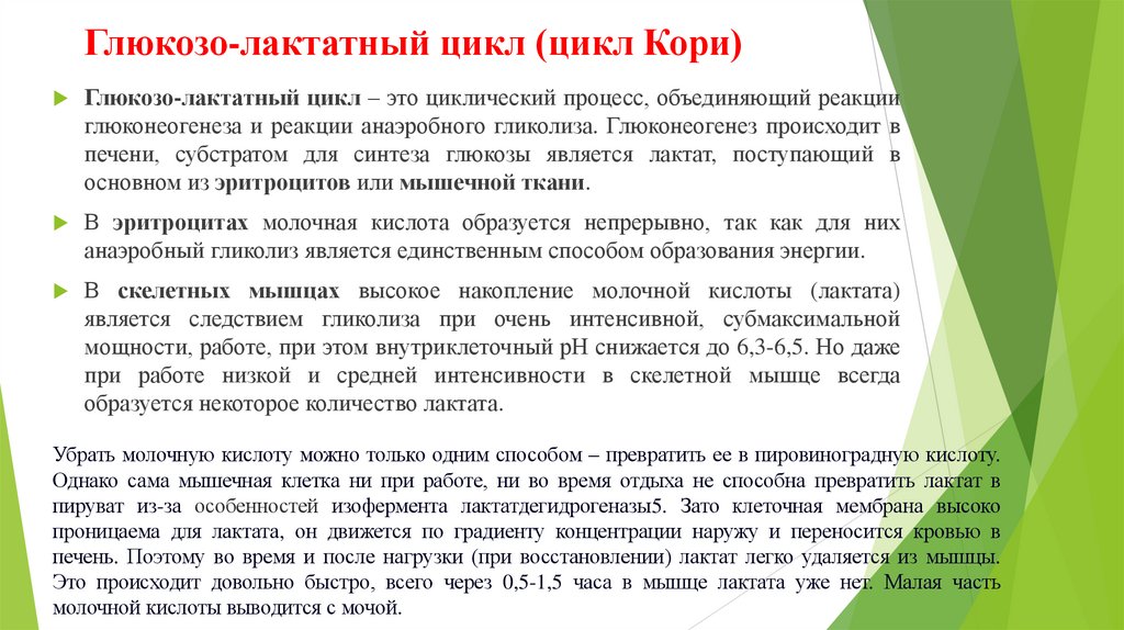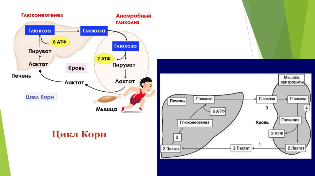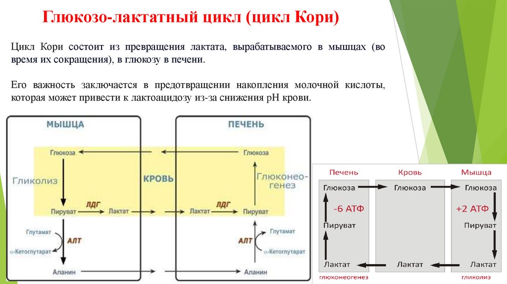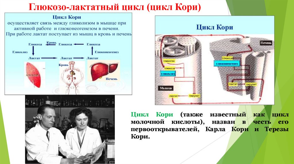 Глюкозо-лактатный цикл (цикл Кори)Цикл Кори состоит из превращения лактата, вырабатываемого в мышцах (во