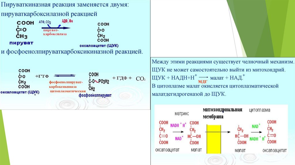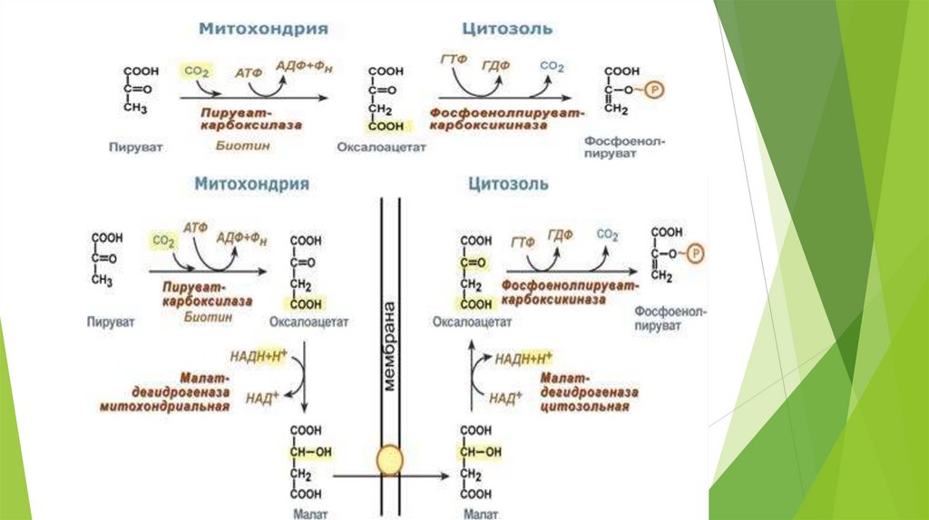Ферменты: пируваткарбоксилаза, малатдегидрогеназа, NADзависимая малатдегидрогеназа, фосфоенолпируват-карбоксилаза.