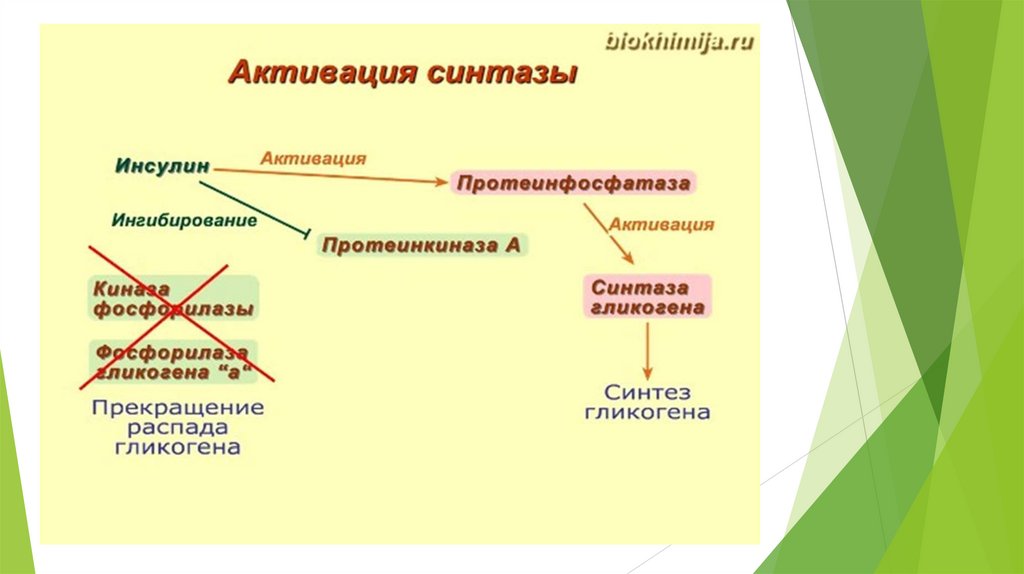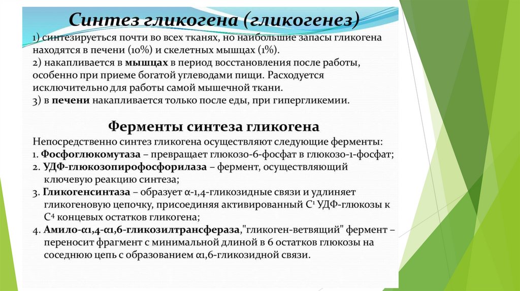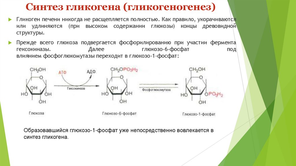 Синтез гликогена (гликогеногенез)Гликоген печени никогда не расщепляется полностью. Как правило, укорачиваются