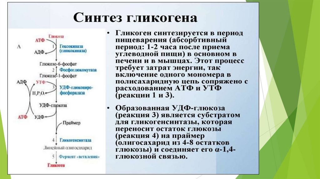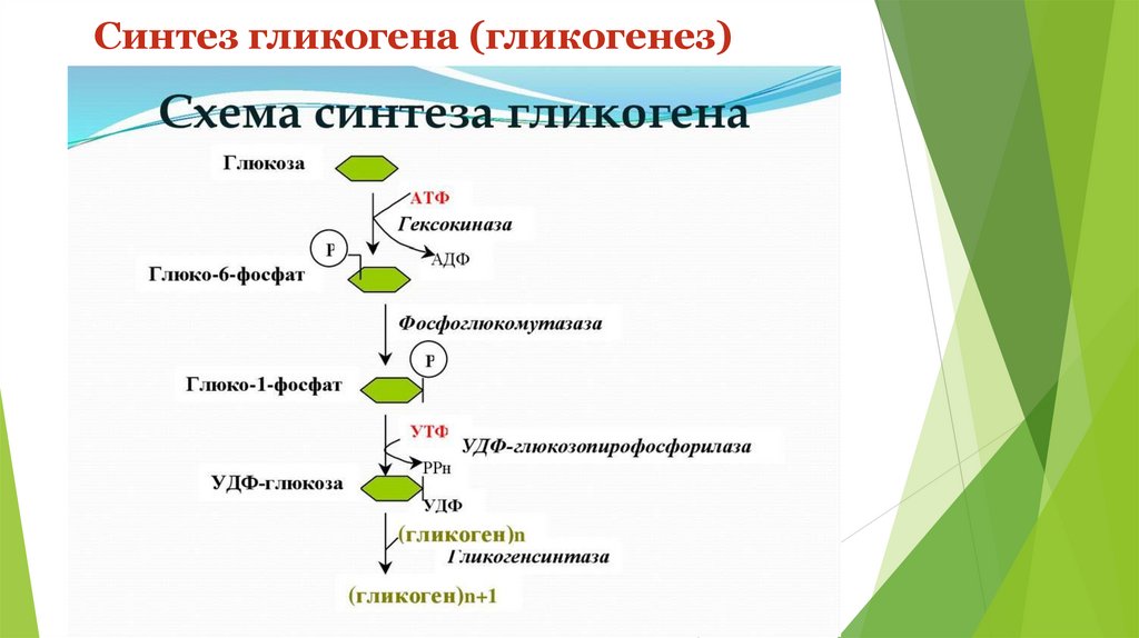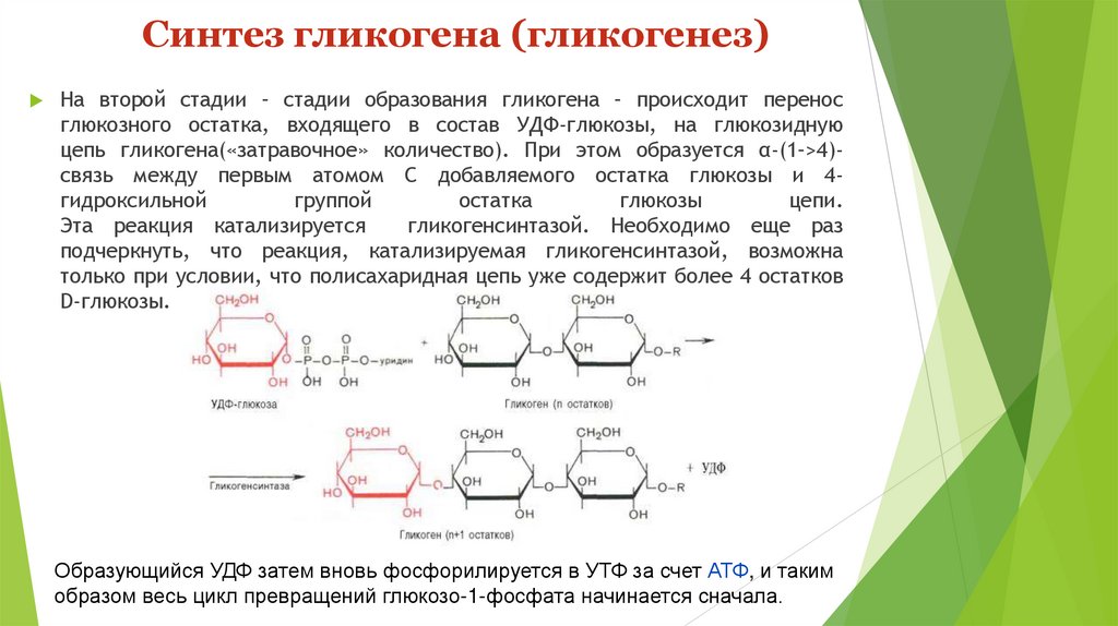 Синтез гликогена (гликогенез)На второй стадии – стадии образования гликогена – происходит перенос