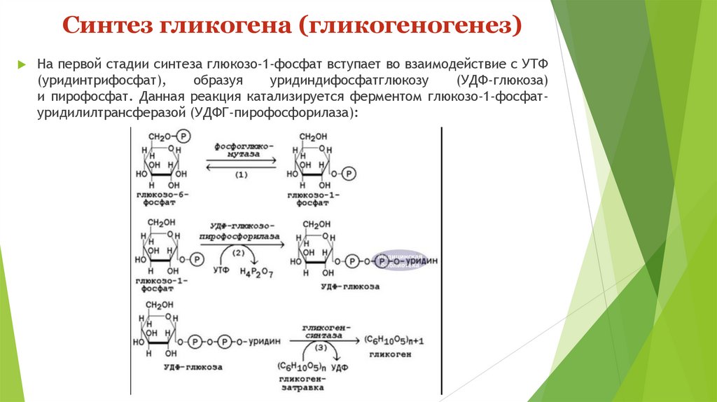 Синтез гликогена (гликогеногенез)На первой стадии синтеза глюкозо-1-фосфат вступает во взаимодействие с УТФ