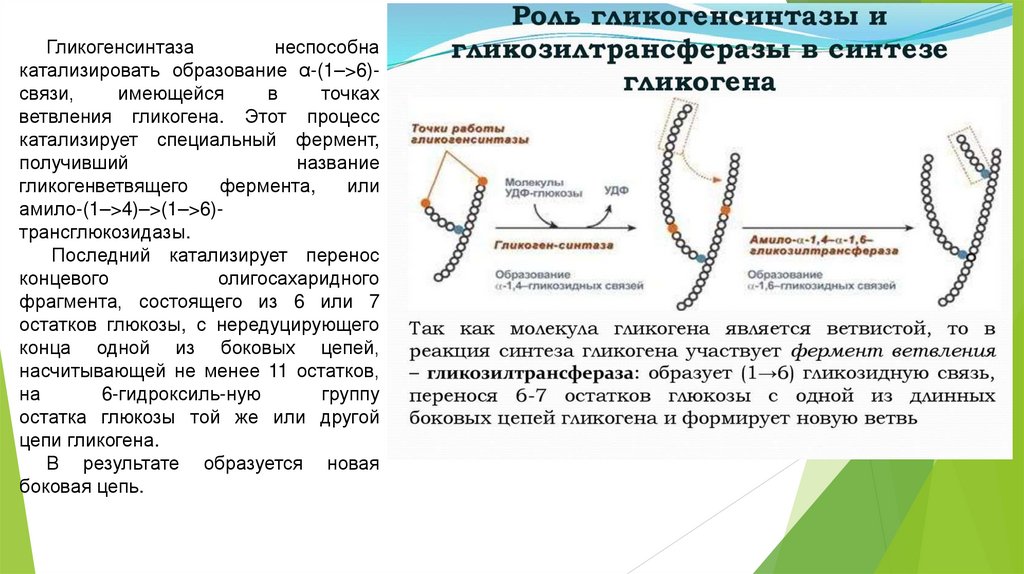цепь гликогена(«затравочное» количество). При этом образуется α-(1–>4)связь между первым атомом С добавляемого остатка глюкозы и 4гидроксильной