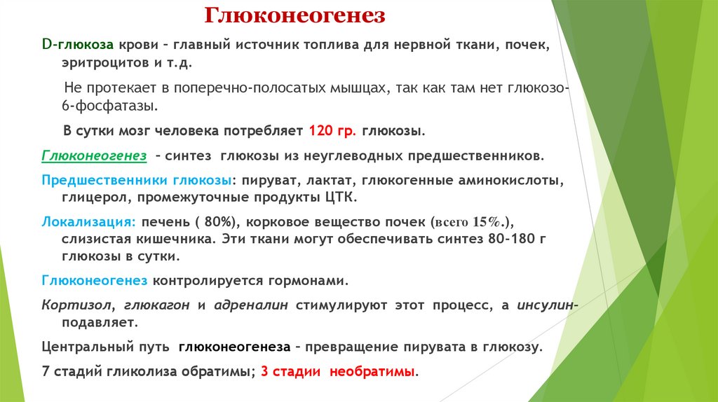 ГлюконеогенезD-глюкоза крови – главный источник топлива для нервной ткани, почек,