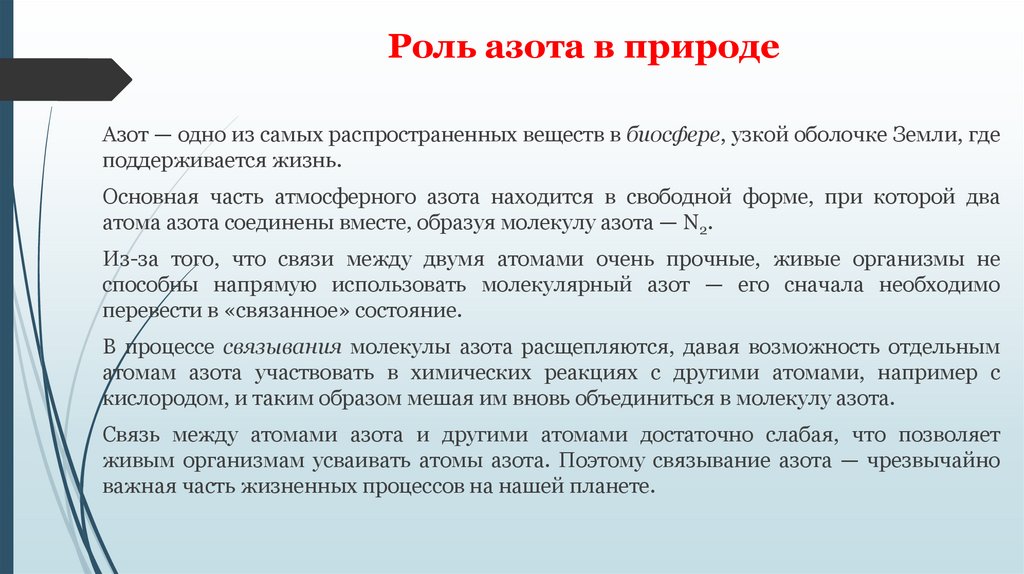 живым организмам усваивать атомы азота. Поэтому связывание азота — чрезвычайно
