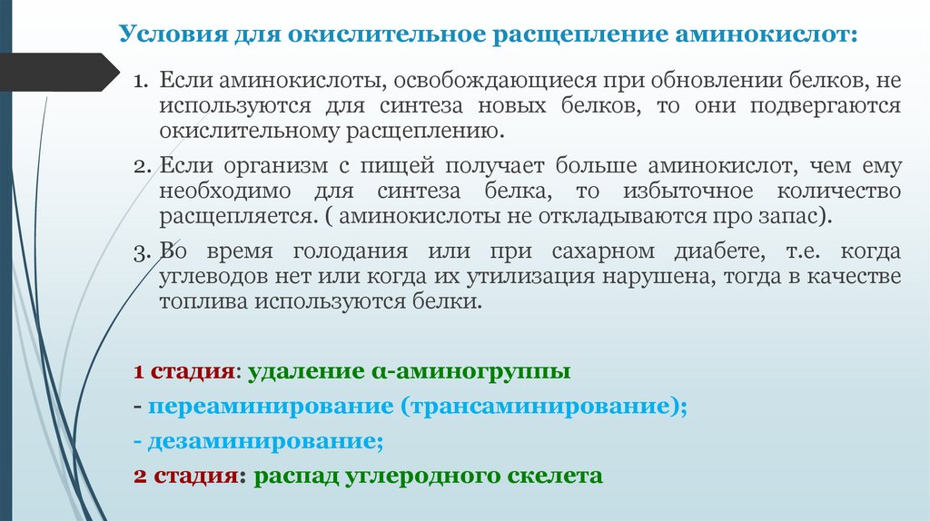 Условия для окислительное расщепление аминокислот:1. Если аминокислоты, освобождающиеся при обновлении белков, не