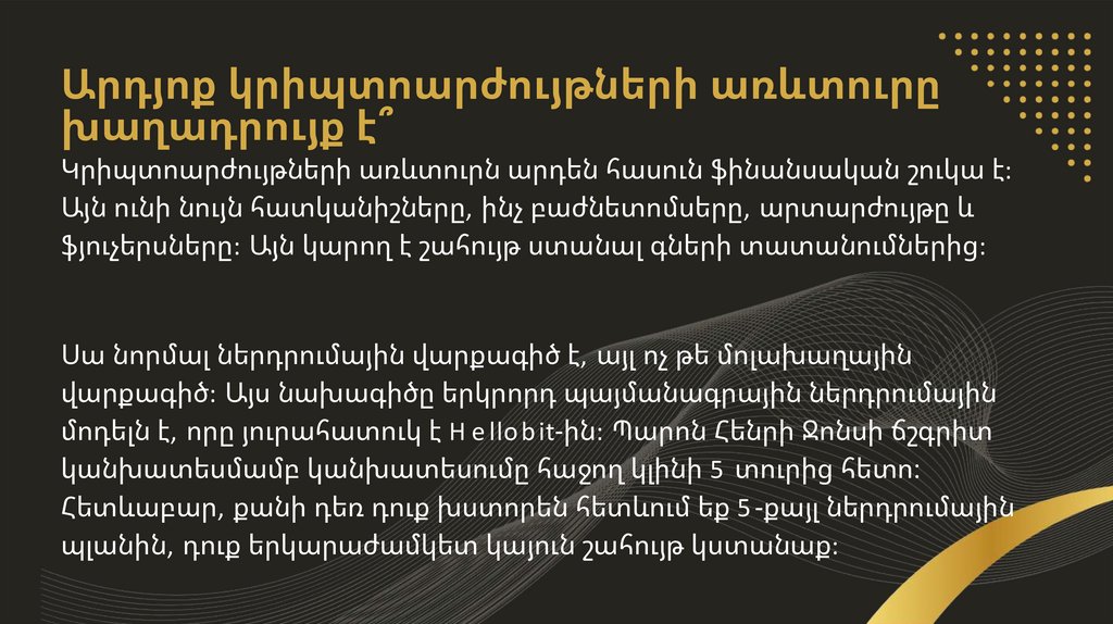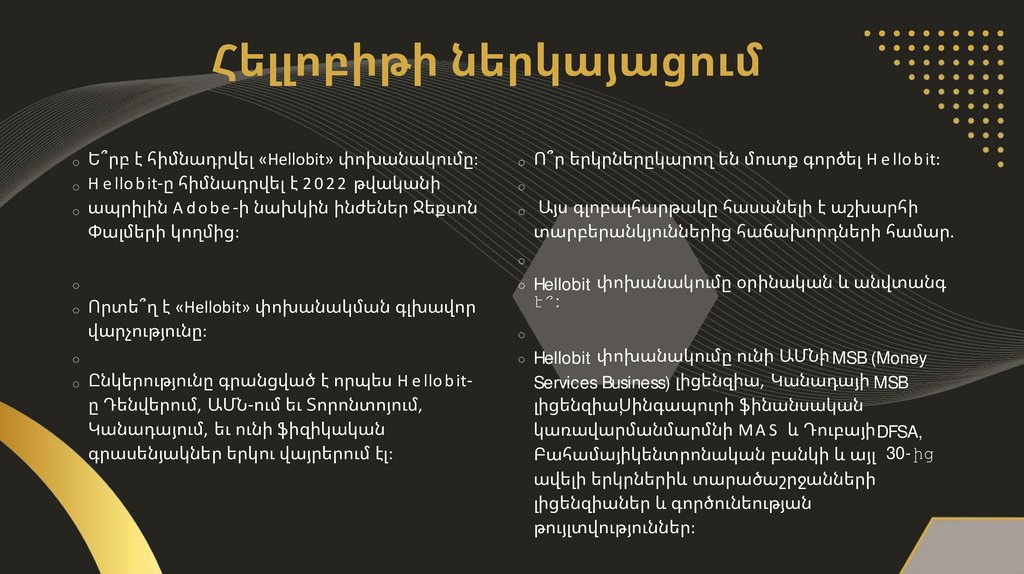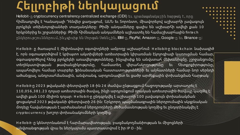 Հելլոբիթի ներկայացումHellobit-ը cryptocurrency centralrency centralized exchange (CEX) եւ դրամապանակային հարթակ է, որը