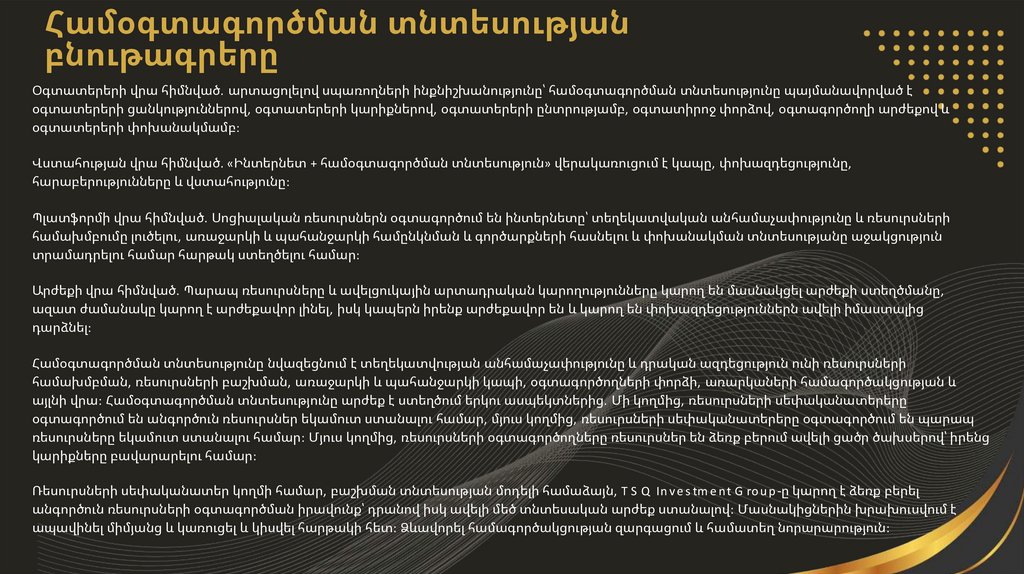 այլնի վրա: Համօգտագործման տնտեսությունը արժեք է ստեղծում երկու ասպեկտներից. Մի կողմից, ռեսուրսների սեփականատերերը