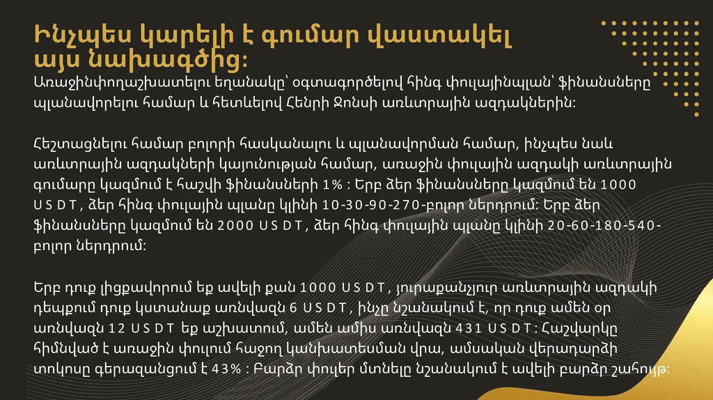 առնվազն 1 2 U S D T եք աշխատում, ամեն ամիս առնվազն 4 3 1 U S D T ։ Հաշվարկը