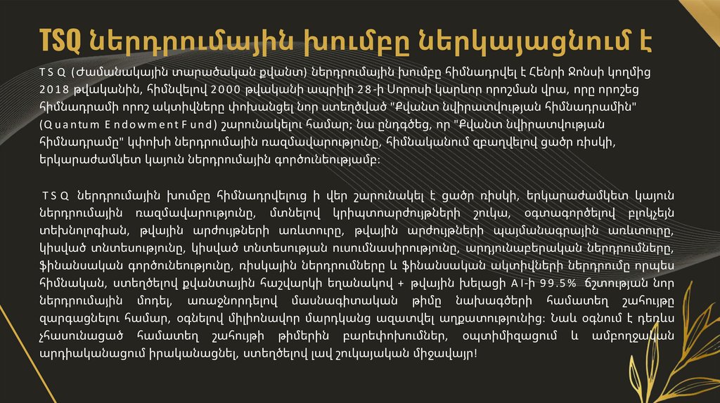 TSQ ներդրումային խումբը ներկայացնում էՔվանտային հիմնադրամը աշխարհում հայտնիմեծածավալ հեջ հիմնադրամներից