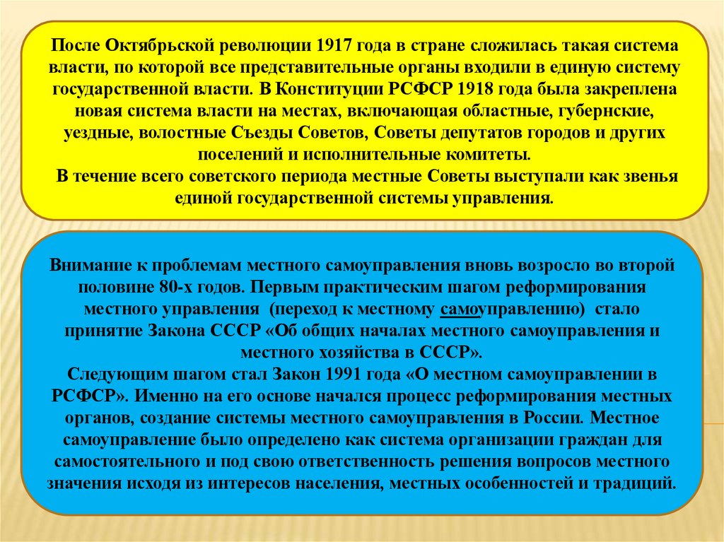 После Октябрьской революции 1917 года в стране сложилась такая системавласти, по которой все представительные органы входили в единую систему