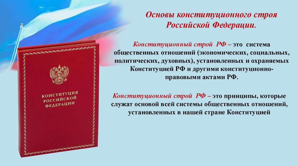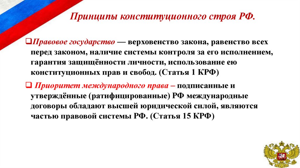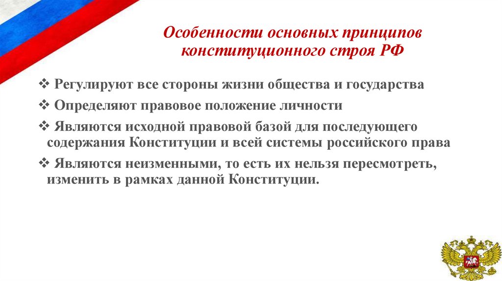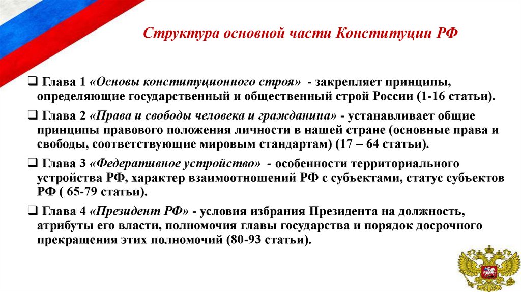 Структура основной части Конституции РФГлава 1 «Основы конституционного строя» - закрепляет принципы,