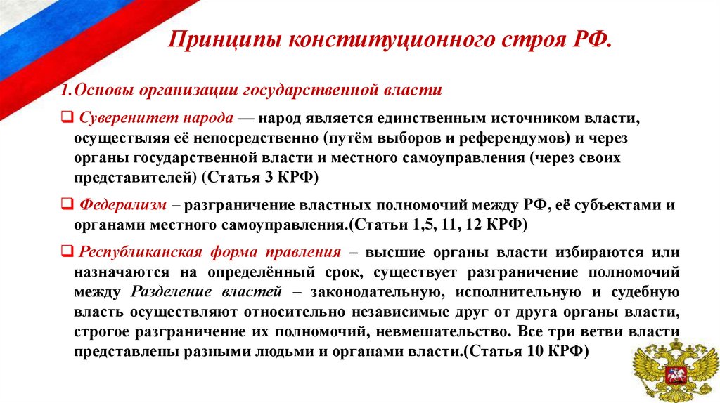 1.Основы организации государственной властиСуверенитет народа — народ является единственным источником власти,
