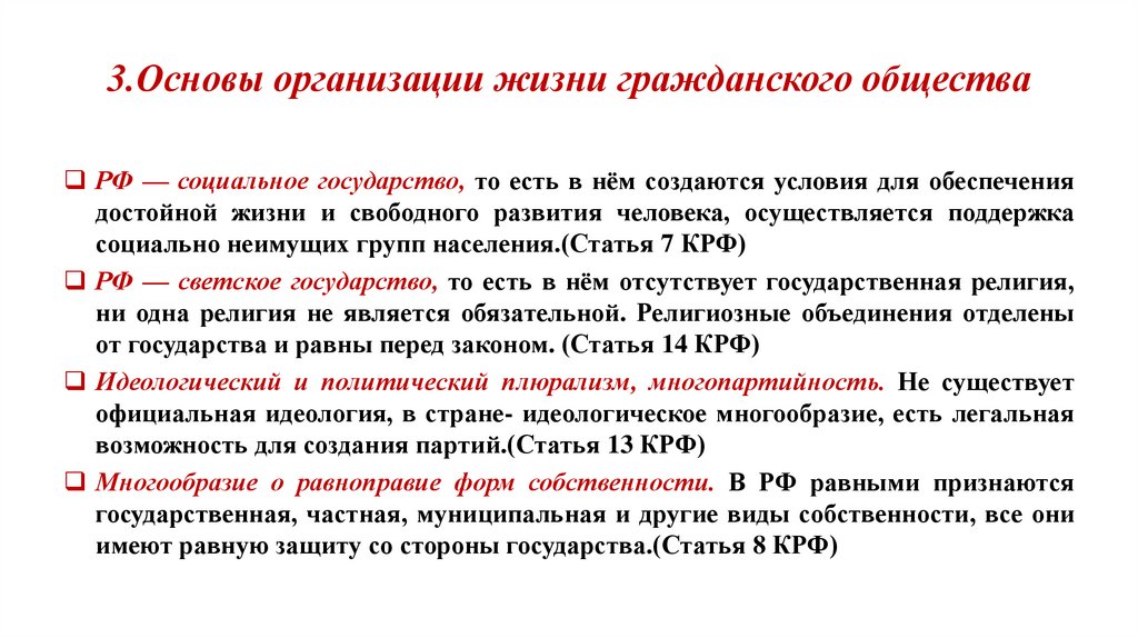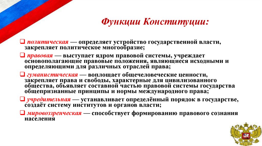 политическая — определяет устройство государственной власти,закрепляет политическое многообразие;