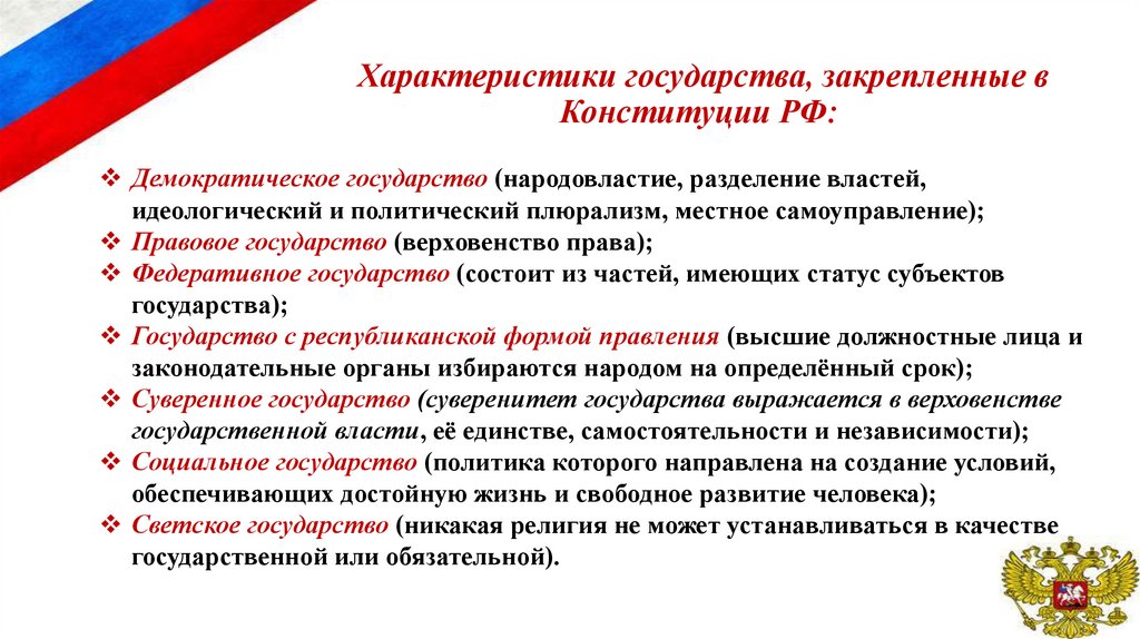16. Характеристики государства, закрепленные в Конституции РФ: