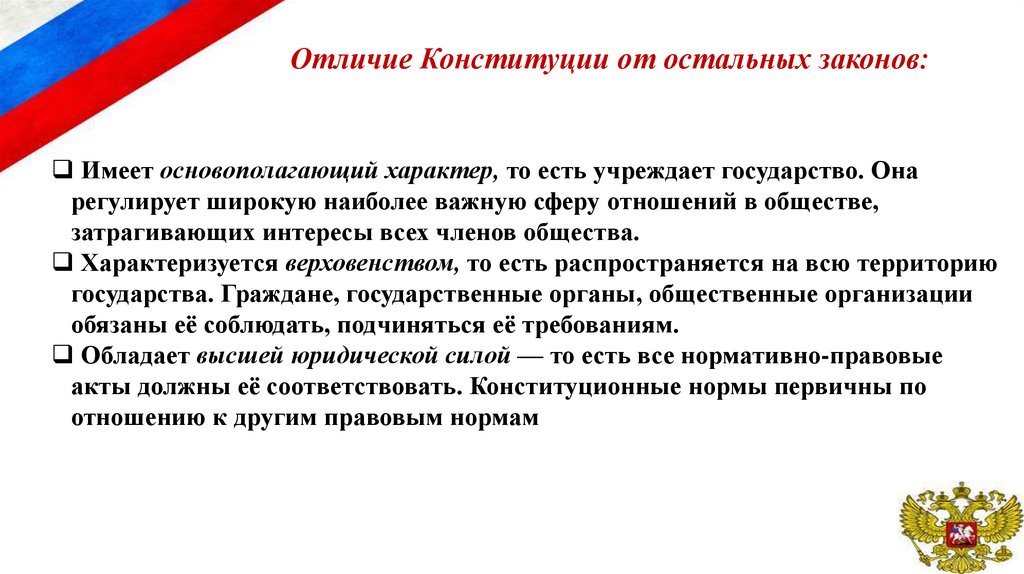 Отличие Конституции от остальных законов:Имеет основополагающий характер, то есть учреждает государство. Она