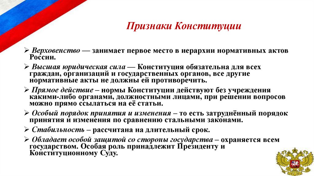 Верховенство — занимает первое место в иерархии нормативных актовРоссии.