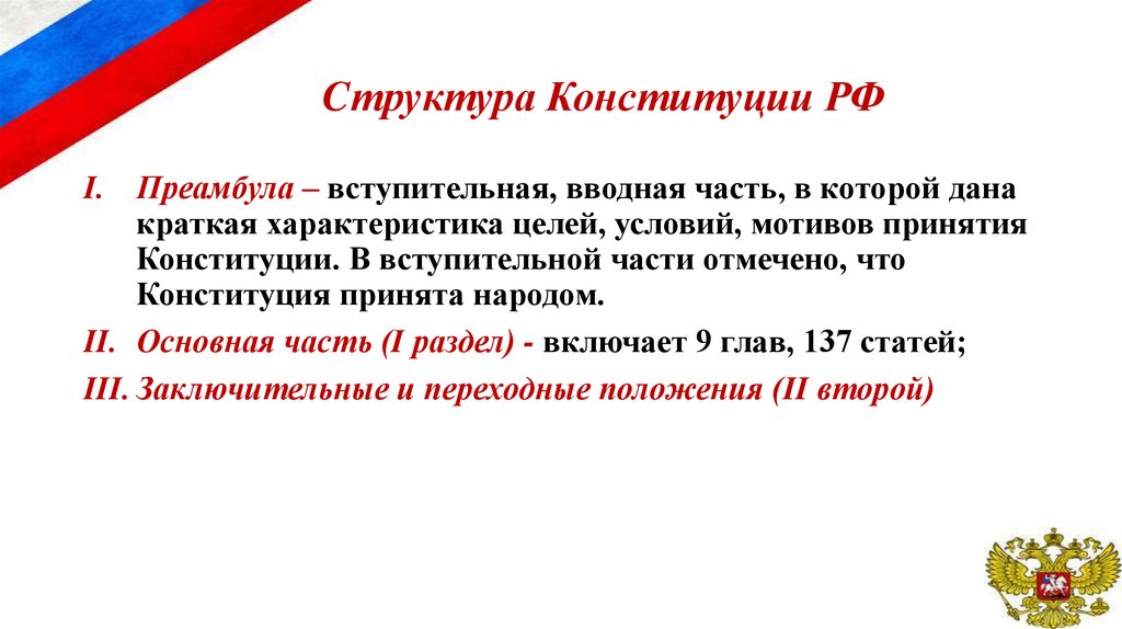 Cтруктура Конституции РФI. Преамбула – вступительная, вводная часть, в которой дана