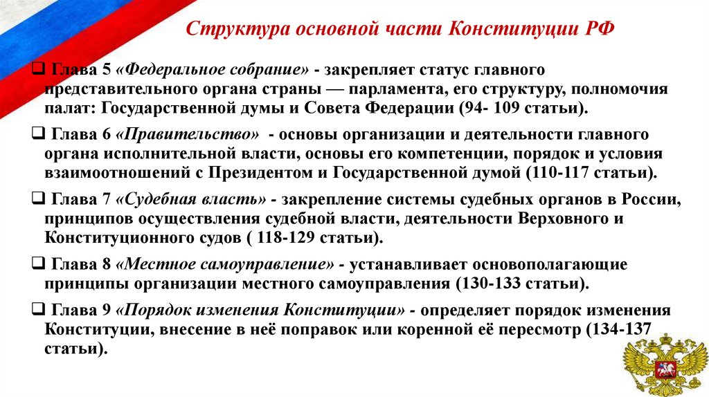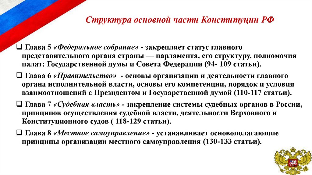 Структура основной части Конституции РФГлава 5 «Федеральное собрание» - закрепляет статус главного