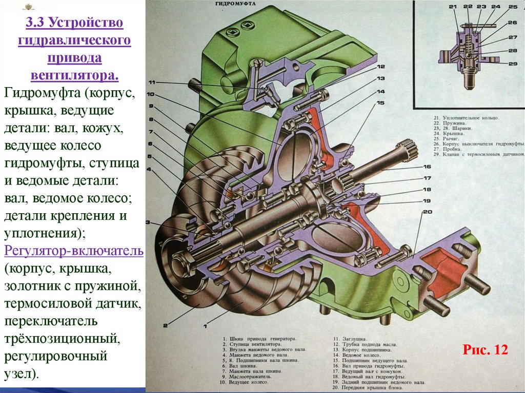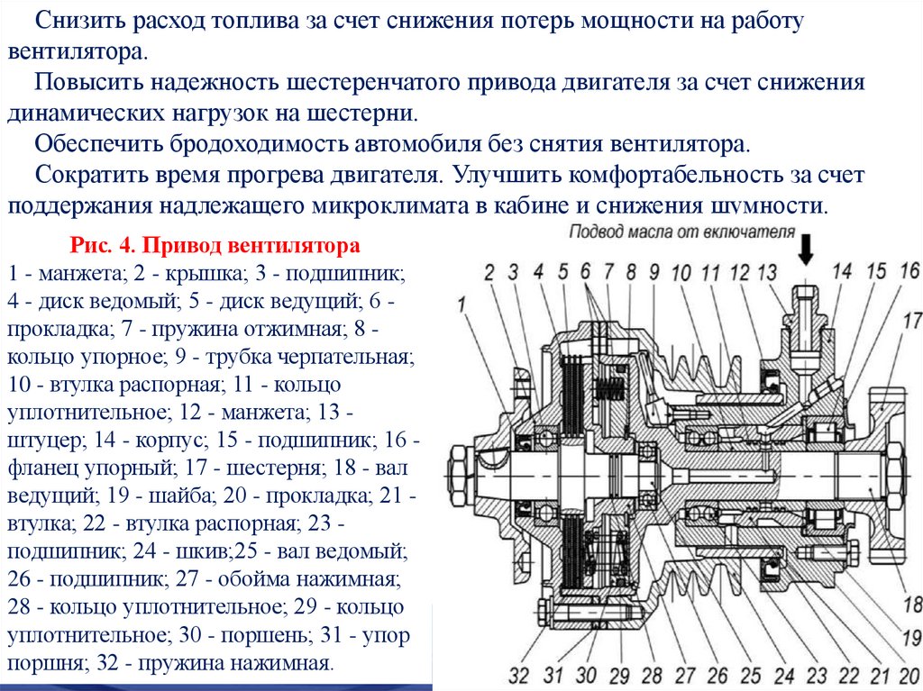 3. Переохлаждение двигателя. Причины: открыты жалюзи в зимнее время,неисправен термостат, рычаг регулятора гидромуфты привода вентилятора