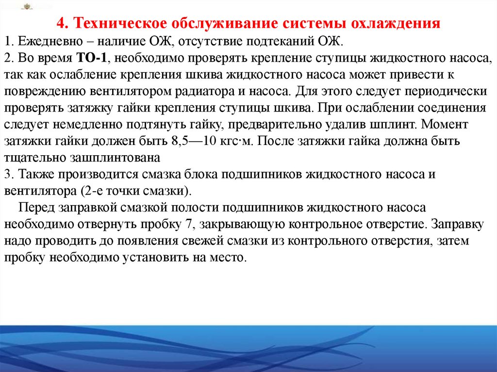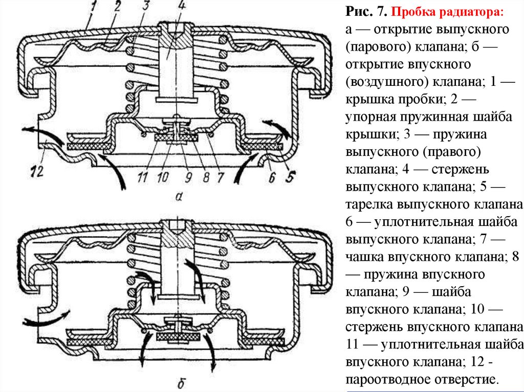 Следует проверять состояние клапанов пробки радиатора. Необходимо следитьза состоянием всех уплотнений, не допускать течи жидкости из системы
