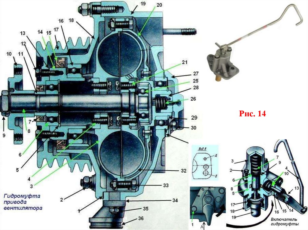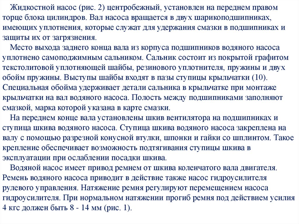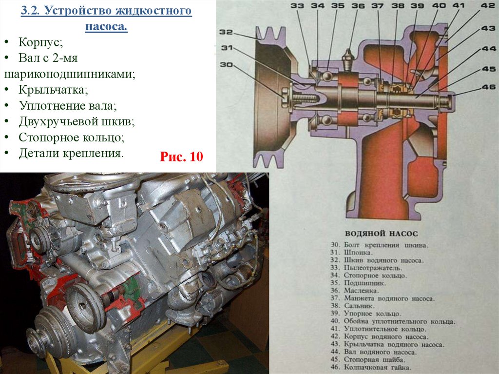 Жидкостной насос (рис. 2) центробежный, установлен на переднем правомторце блока цилиндров. Вал насоса вращается в двух шарикоподшипниках,