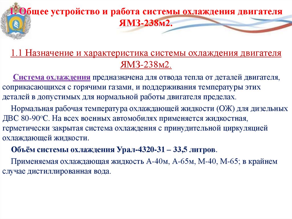 1.1 Назначение и характеристика системы охлаждения двигателяЯМЗ-238м2.