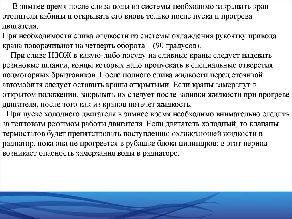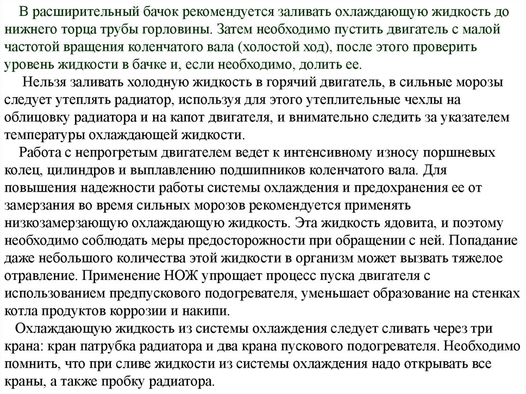 Категорически запрещаются пуск и кратковременная работа двигателя безжидкости в системе охлаждения, а также прогрев двигателя после слива