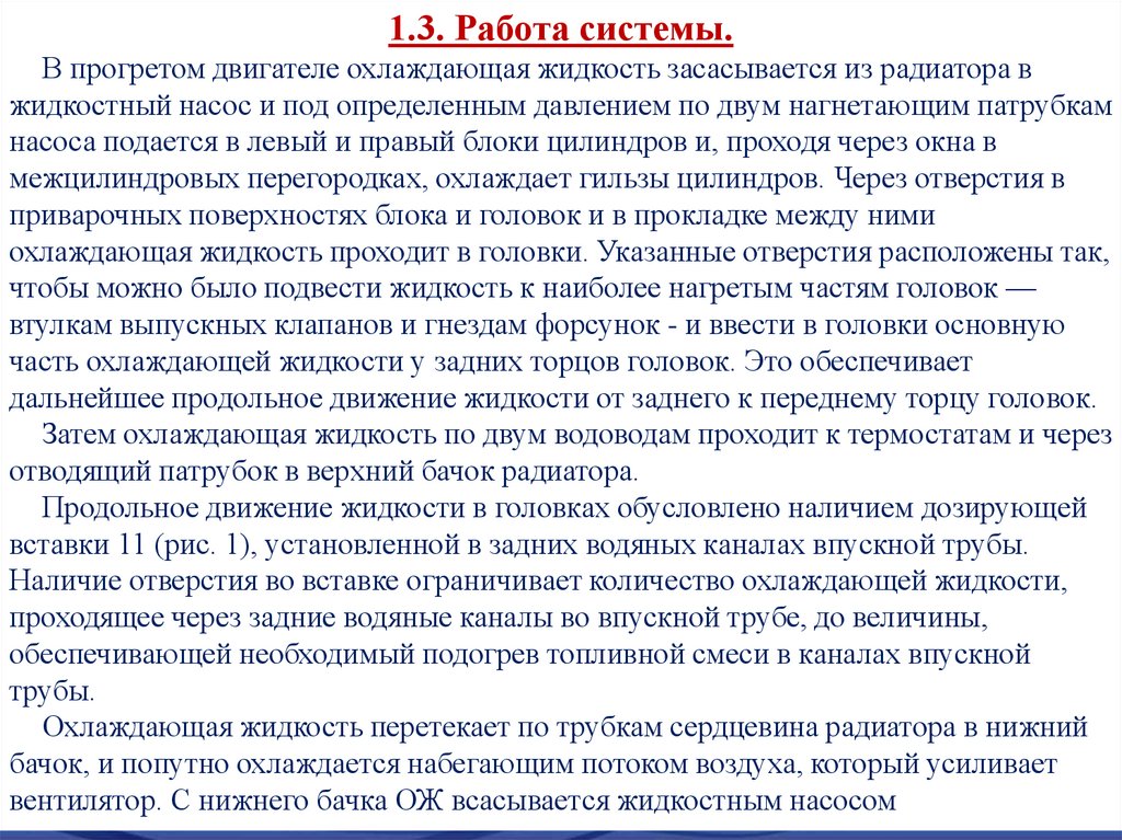 1.3. Работа системы.В прогретом двигателе охлаждающая жидкость засасывается из радиатора в